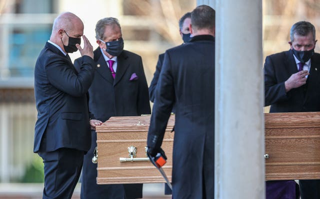 Chief medical officer Dr Tony Holohan (centre) arrives for the funeral mass of his wife Dr Emer Feely, at St Pius X Church, Terenure, Dublin (Damien Storan/PA)