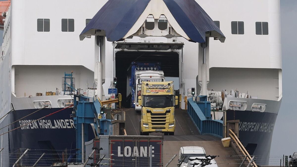 Lorries driving off the European Highlander P&O ferry at the Port of Larne. Picture: PA