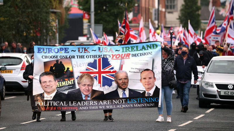 There is significant anger among unionists and loyalists at the protocol which was agreed by the UK and EU as a way to maintain free-flowing land border on the island of Ireland after Brexit.