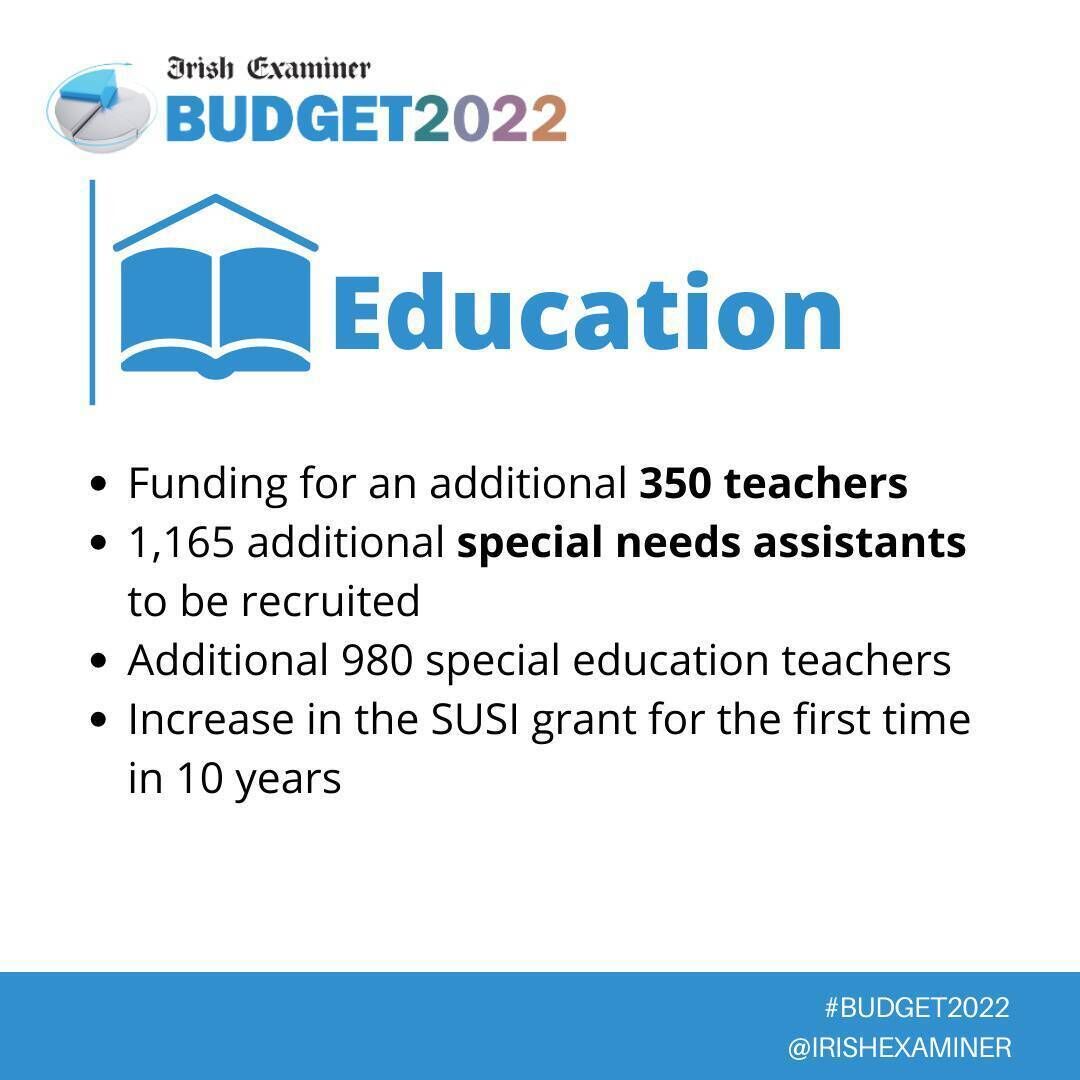 - Funding for more than 1,000 special needs assistants and an increase in the SUSI grant for the first time in 10 years.