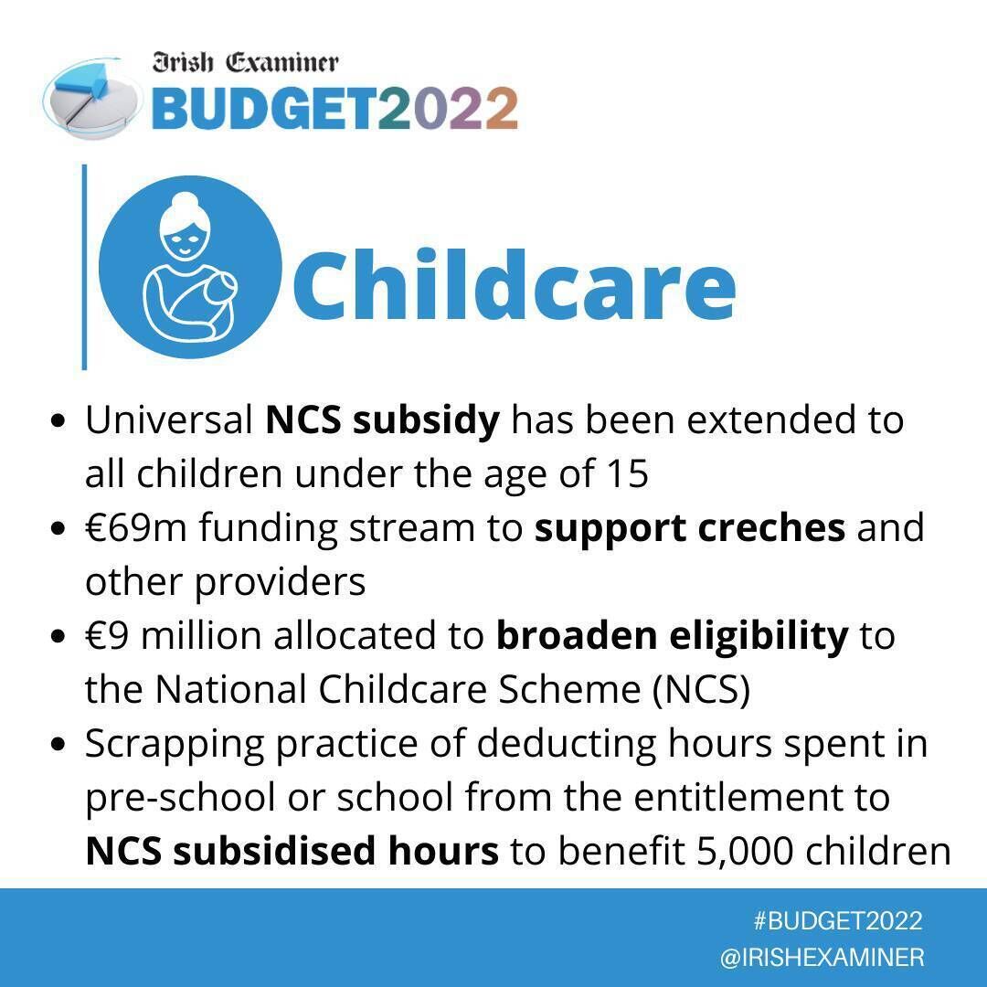- An allocation of €9m to broaden eligibility to the NCS, which the Government says shows the commitment to reform the childcare sector.