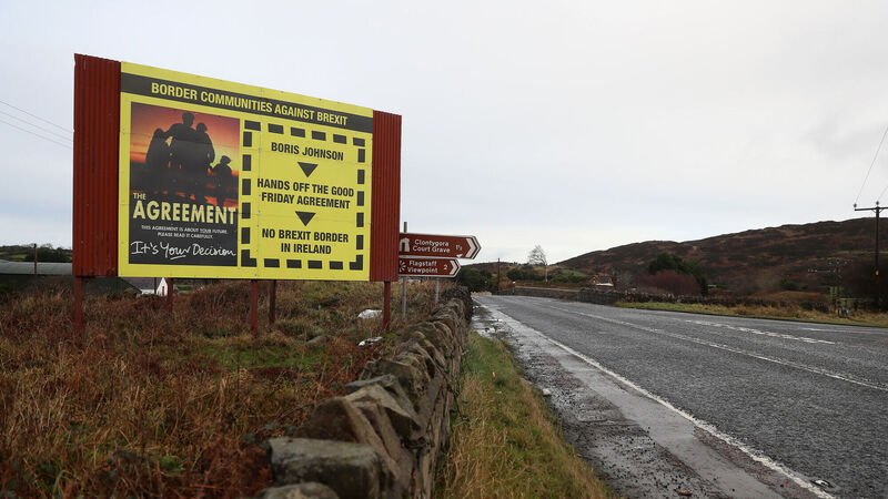 An anti-Brexit billboard at the border. While the Common Travel Area (CTA) allows Irish and UK citizens free movement North and South, and East and West, it does not apply to EU nationals who have made the island of Ireland their home. Photo: Brian Lawless/PA