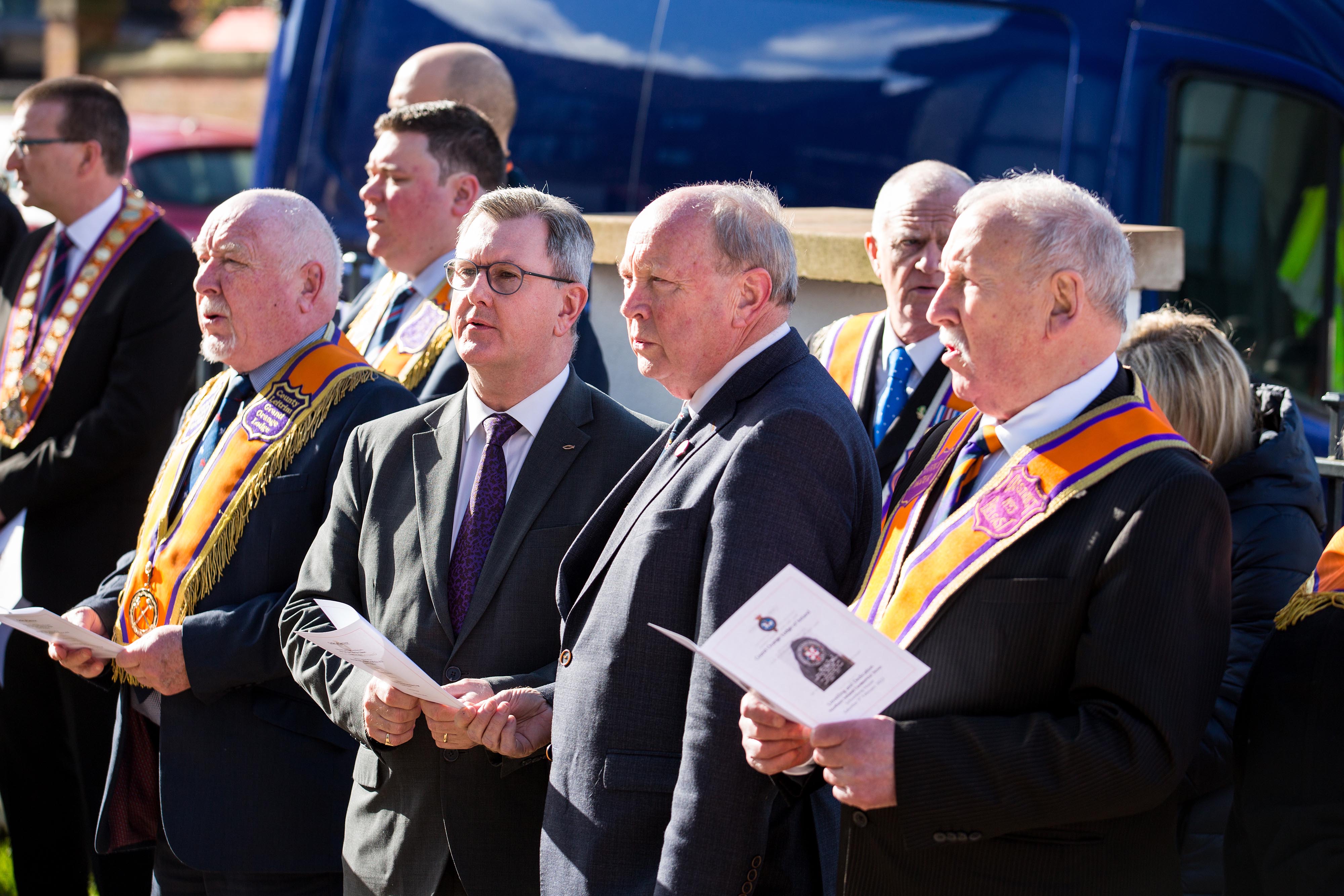 Among those who attended the event at the Orange Order’s headquarters in Belfast were DUP leader Jeffrey Donaldson and TUV leader Jim Allister.
