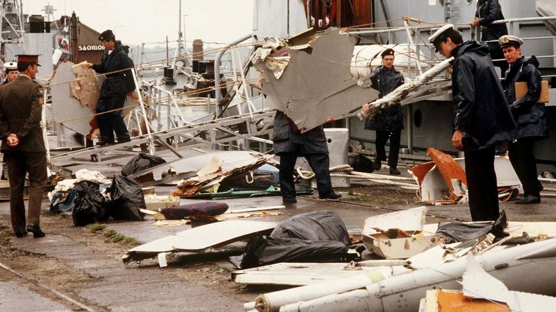 Irish naval authorities bring ashore debris after the Air India Boeing 747 crash in Cork in June 1985. Picture: Andre Durand/AFP/Getty Images