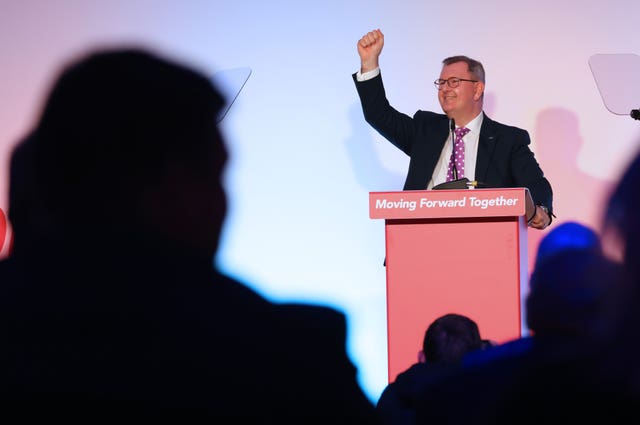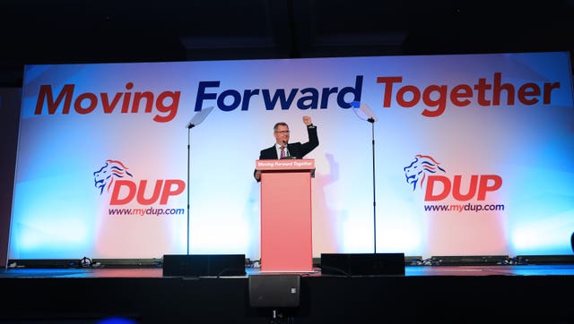 DUP party leader Sir Jeffrey Donaldson addresses delegates at their party conference at the Ramada Hotel in Belfast (PA)