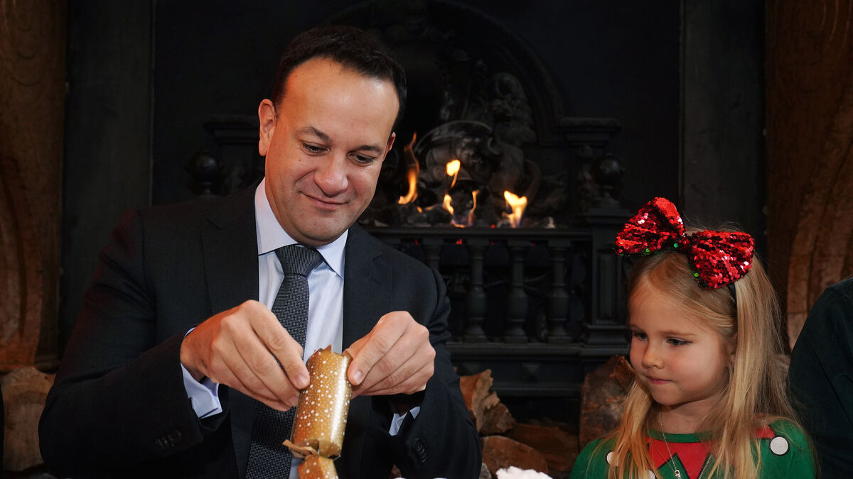 Taoiseach Leo Varadkar checks his Christmas cracker with Alina Chorna five, from Ukraine (Brian Lawless/PA)