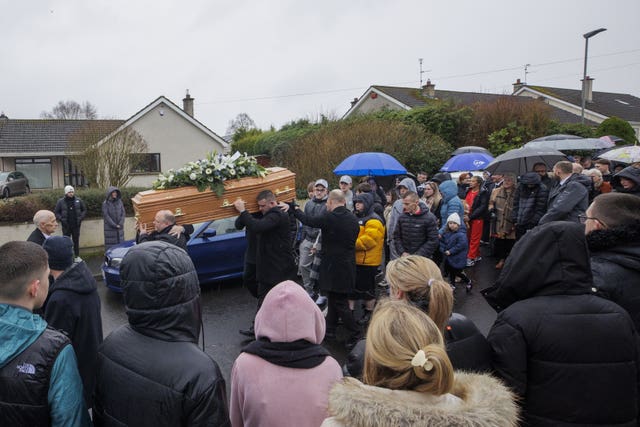 The coffin of Blake Newland is carried out of the home of his grandmother in Limavady, Co Derry (Liam McBurney/PA)