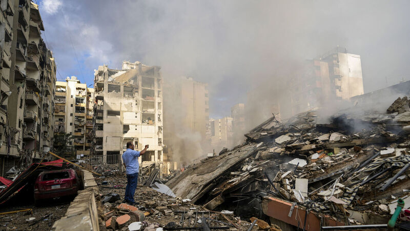 A man documents the damaged buildings at the site of an Israeli airstrike in Beirut's southern suburb on Tuesday. Picture: AP/Hassan Ammar