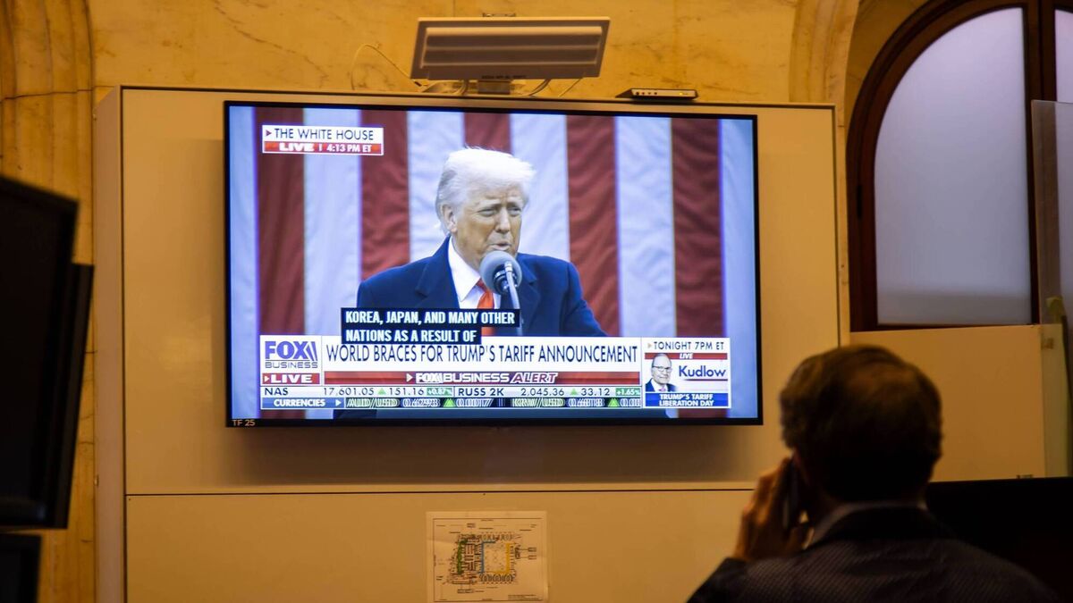 A New York Stock Exchange trader watching a TV broadcast of Donald Trump speaking from the White House on Wednesday. The tariffs he announced have caused markets to tumble worldwide. Picture: Michael Nagle/Bloomberg