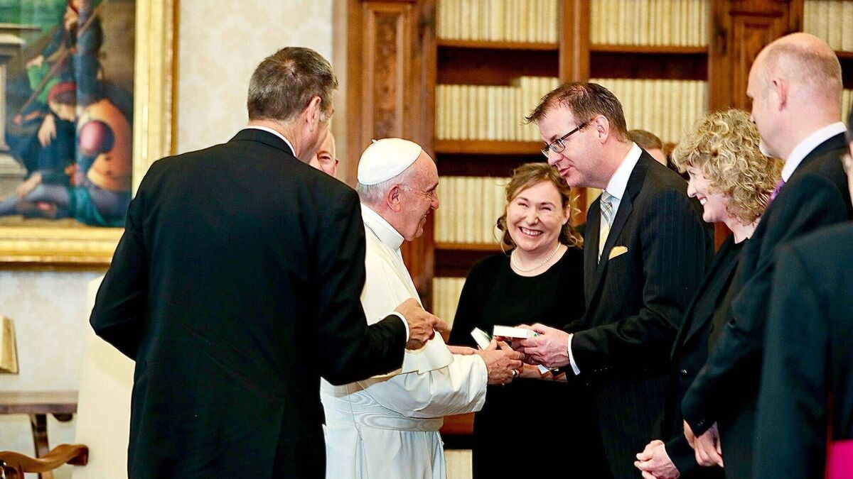 Art O' Leary, centre right, meeting Pope Francis when he visited the Vatican City in 2017 while working for President Micheal D Higgins. Art's father Bill O' Leary was a religious man who died in 2014, and Art wore his father's shoes to meet the Pope. The smiles in the photograph are as the translator tells the Pope about the shoes.