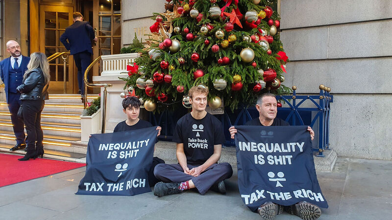 Take Back Power protesters outside London's Ritz Hotel last week after dumping horse manure beside the hotel's Christmas tree in a demonstration against wealth inequality. The World Inequality Report 2026 found that in almost every region, the top 1% was wealthier than the bottom 90% combined. File photo: Take Back Power/PA