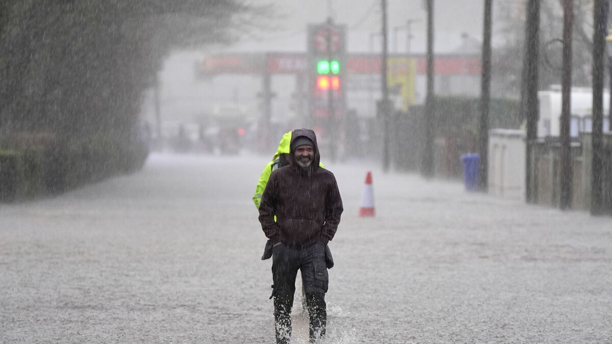 People walking through flooded roads in Bunclody, Co. Wexford. Picture: Niall Carson/PA Wire
