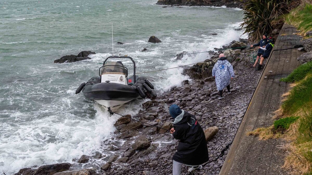 A rib broke its moorings and smashed onto the rocks in Schull, West Cork, during Storm Dave. Picture: Andy Gibson