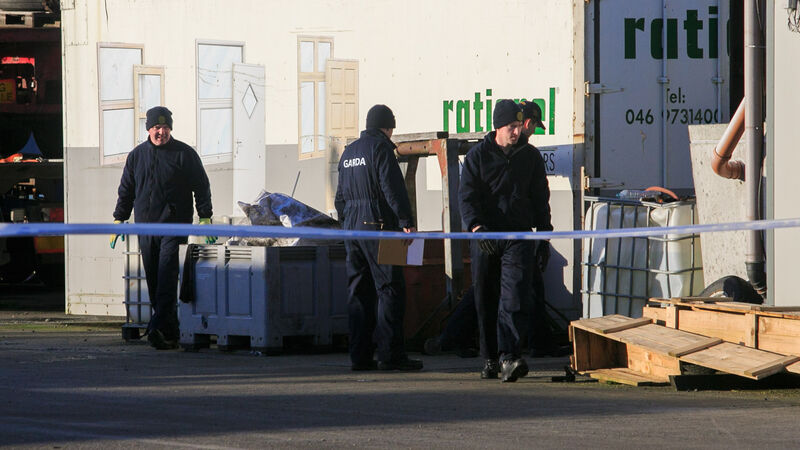 Members of the Gardai at the scene of a shooting at an industrial estate on Killeek Lane, Co Dublin. Picture: Gareth Chaney/Collins
