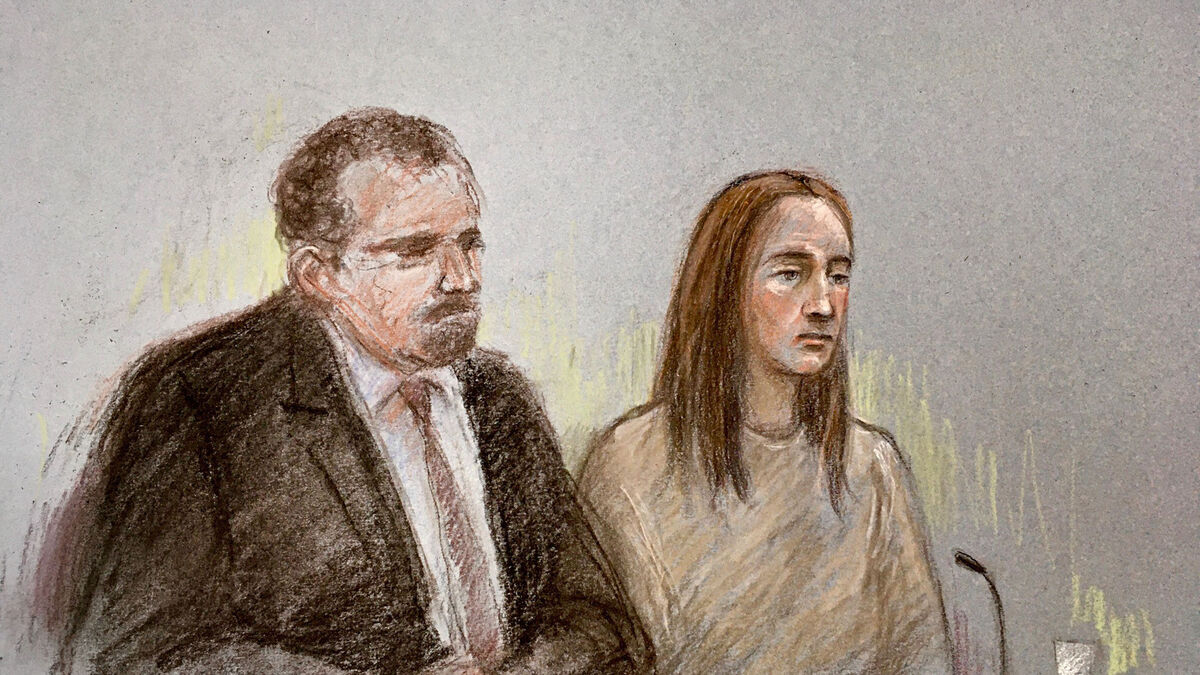Court artist sketch by Elizabeth Cook of Lucy Letby, next to her solicitor Richard Thomas, appearing via video link at Warrington Magistrates' Court.