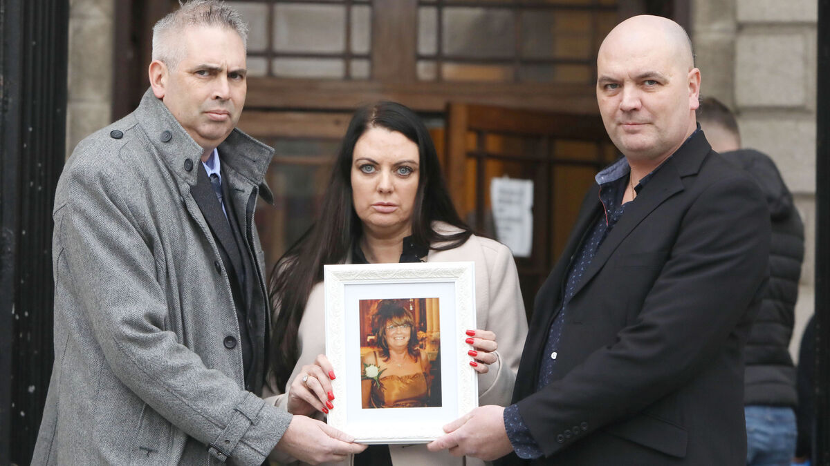 (Left to right) Niall, Aoife and Shane Halligan hold a photo of her late mother Aileen after they settle their High Court action against a cardiologist over her death. Photo: Collins Courts