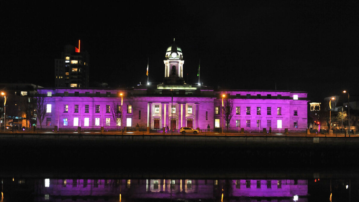 Cork City Hall is lit up in a virtual hug for #NationalHuggingDay. Picture: Larry Cummins