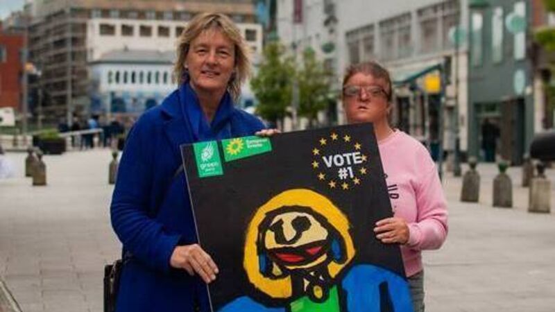 MEP Grace O’Sullivan and artist Yvonne Condon with a new election poster using the portrait. Picture: Oscar O'Connor