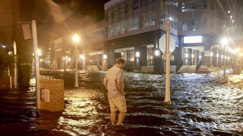 A man walks surge waters flooding the street after Hurricane Milton came ashore in the Sarasota area. Picture: Joe Raedle/Getty Images