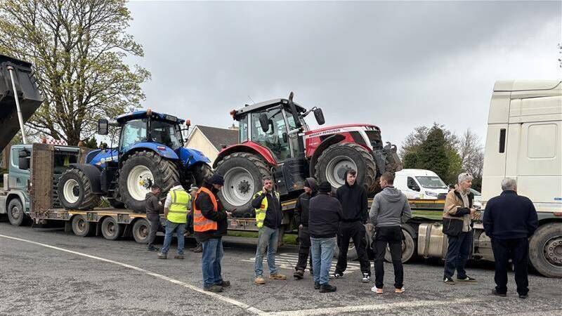 More than 100 people were gathered on the road just after 9am, with more than 60 trucks, tractors, lorries and cars blocking the road from the city side, with traffic diverted through the town.