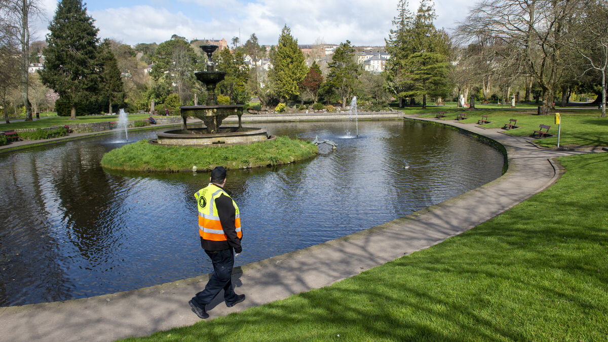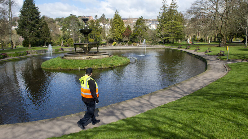 A security man on patrol in a near deserted Fitzgerald’s Park in Cork. Picture: Dan Linehan