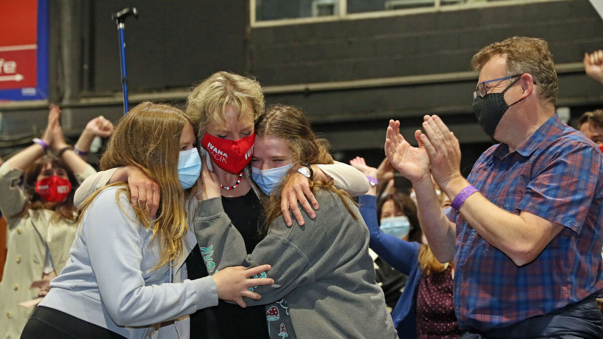 Labour Candidate Ivana Bacik celebrates with (left to right) her daughters Louis and Cyan, and her husband Alan Saul, after being declared the winner for the Dublin Bay South by-election. Picture: Brian Lawless/PA Wire