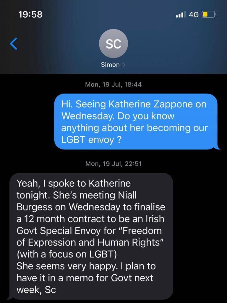 “Hi Leo, from the Piglet [a Dublin bar]! I was expecting to hear from Simon C about my appointment as Special Envoy for Human Rights and LGBTQ+ issues. Have you heard anything? If you around next Wednesday hope to meet you.”
