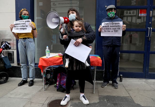 Protesters gathered outside Green Party headquarters in Dublin on Friday to protest against the party’s response to comments made in a WhatsApp group by Limerick TD Brian Leddin.