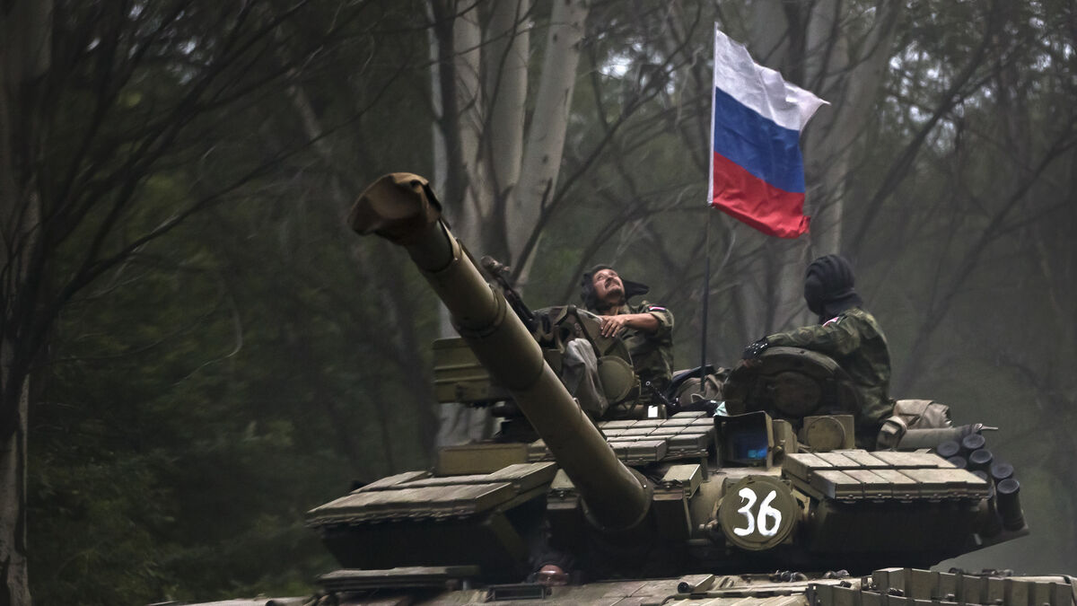 A pro-Russian rebel looks up while riding on a tank flying Russia's flag, on a road east of Donetsk, eastern Ukraine in 2015. File picture: AP Photo/Vadim Ghirda