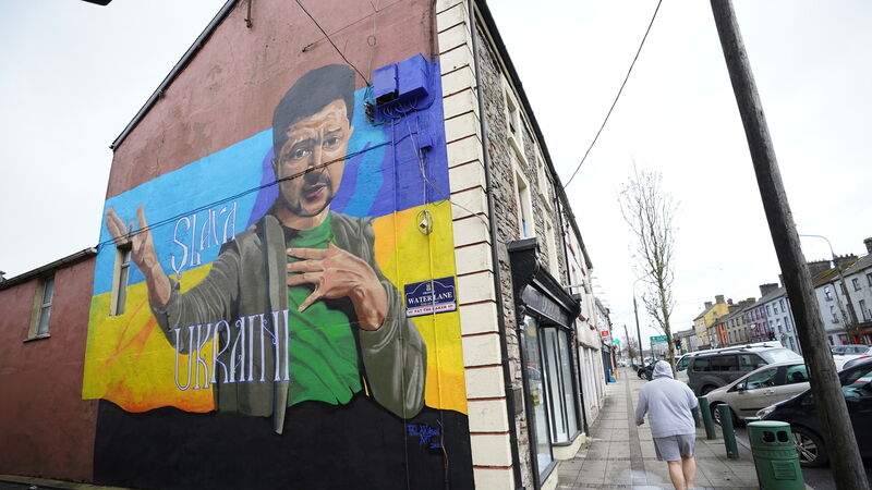 People pass a mural of President of Ukraine Volodymyr Zelenskyy, by the artist Phil Atkinson in Granard, Co Longford. Picture: Niall Carson/PA