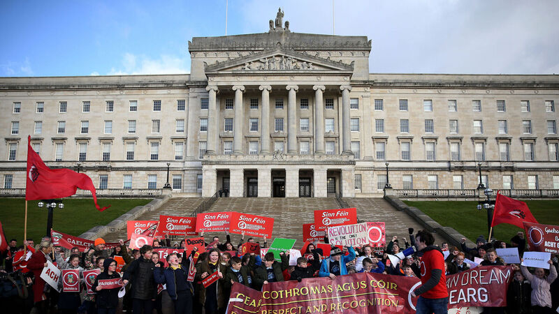 Irish language act campaigners at Stormont. Conradh na Gaeilge walked out of a meeting on Tuesday with junior minister Conor Burns. Picture: Brian Lawless/PA