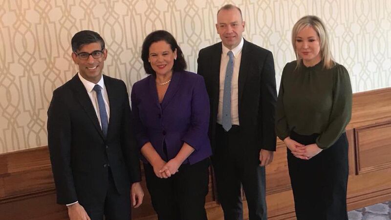 British prime minister Rishi Sunak, Sinn Féin leader Mary Lou McDonald, UK Northern Ireland secretary Chris Heaton-Harris and Sinn Féin vice president Michelle O'Neill at the Culloden Hotel in Belfast today. Picture: Twitter/Michelle O'Neill/PA Wire