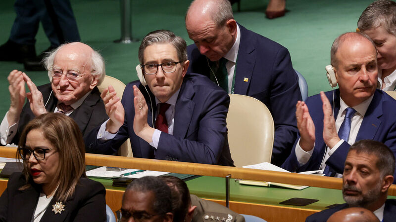 Taoiseach Simon Harris flanked by President Michael D Higgins and Tánaiste Micheál Martin at the UN General Assembly. Mr Harris will visit Washington DC next month to mark the centenary of the USA's recognition of Ireland on October 7, 1924. Picture: Tony Maxwell/PA