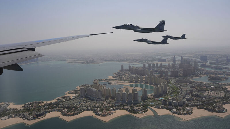 Qatar Emiri Air Force F-15s provide an honorary escort for Air Force One, carrying President Donald Trump, as it arrives in Doha, Qatar, on Wednesday. Picture: AP/Alex Brandon