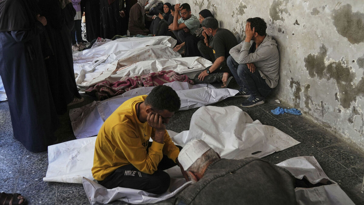 Palestinians mourn their relatives who were killed in an Israeli army airstrike and brought to the Baptist Hospital in Gaza City on Monday. Photo: AP/Jehad Alshrafi