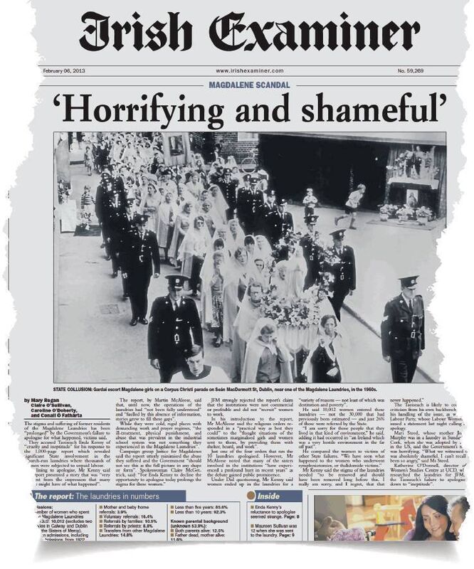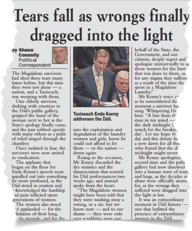 "Sadly, [her case is] one that's indicative of a long litany of cases in Ireland," Mr. Kenny said. "That's why in the past we've had to deal with an exceptional number of cases that scar our memory.” The State established an ex gratia [without obligation] scheme to provide redress to other survivors, the design of which was not subjected to in-put from survivors or opened up to public consultation.