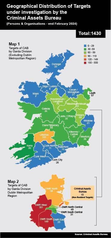 As the map shows, CAB had a total of 1,430 targets at the end of last month, including 653 in the Dublin Metropolitan Region and 762 in the rest of the country.