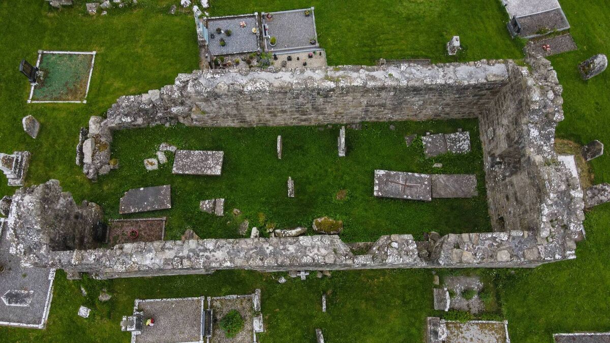 An aerial view of St Manchan's church at the ancient monastic site at Lemanaghan, Co Offaly. Picture: Annie Holland