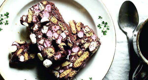 A relative newcomer to the rows of traybakes and fridge cake, the Rocky Road, has broken the straight-sided mould of the usual suspects and is often presented in irregular chunks. Unlike the many other sugary squares, this is one recipe where you can make a huge difference to the taste, despite the, frankly, trashy ingredients, by using really good chocolate and good quality dried fruit.