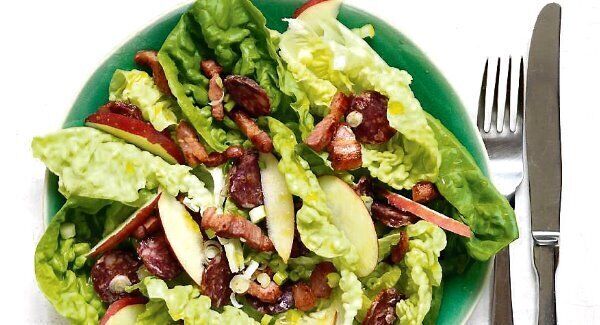 Fry the bacon until crisp, then scatter it and the apple slices evenly over the leaves. Drizzle with a vinaigrette made from the oil and vinegar, and seasoned with salt and pepper.