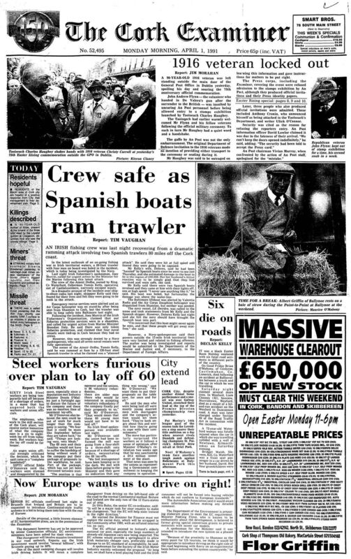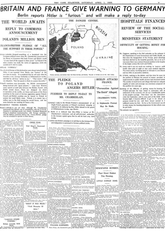 April 1: ‘Britain and France give warning to Germany’ was the headline in the Cork Examiner, which detailed how prime minister Neville Chamberlain had “dropped something of a bombshell” when he announced a Franco-British pledge to lend “all their support in their power” to guarantee Poland’s territorial integrity. While Hitler had yet to respond to the development he was understood to be “furious”.