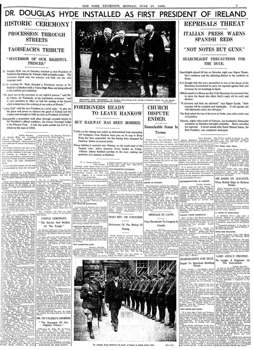 June 25: Douglas Hyde was inaugurated as the first president of Ireland in an Irish-language ceremony that lasted only 10 minutes.
