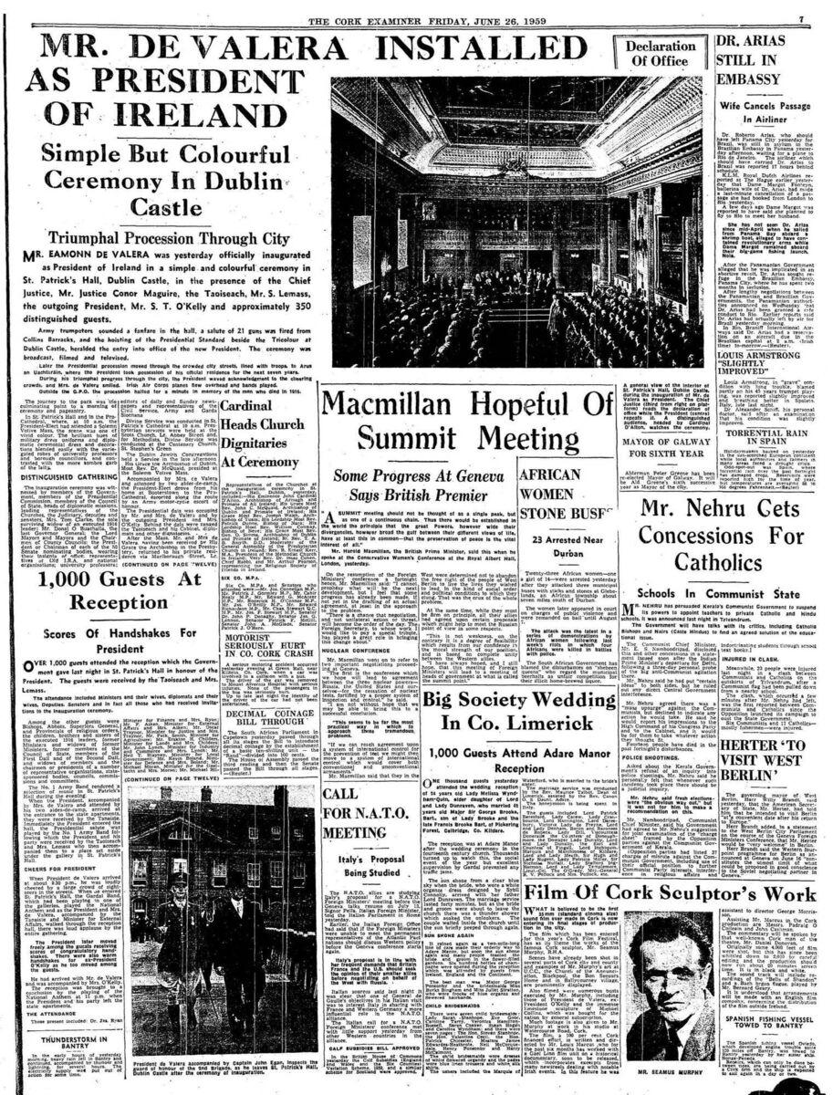 Seán T O'Kelly became the second president of Ireland. It was reported that he took office after attending Solemn Votive Mass at the Pro-Cathedral Dublin.