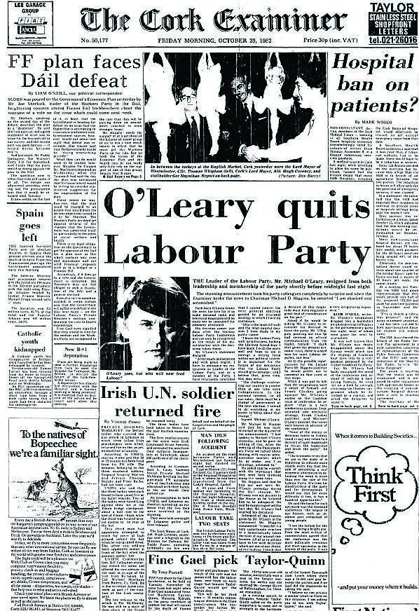 The stunning announcement took his party colleagues completely by surprise and when the Cork Examiner broke the news to chairman Michael D Higgins, he retorted: “I am shocked and astonished”.