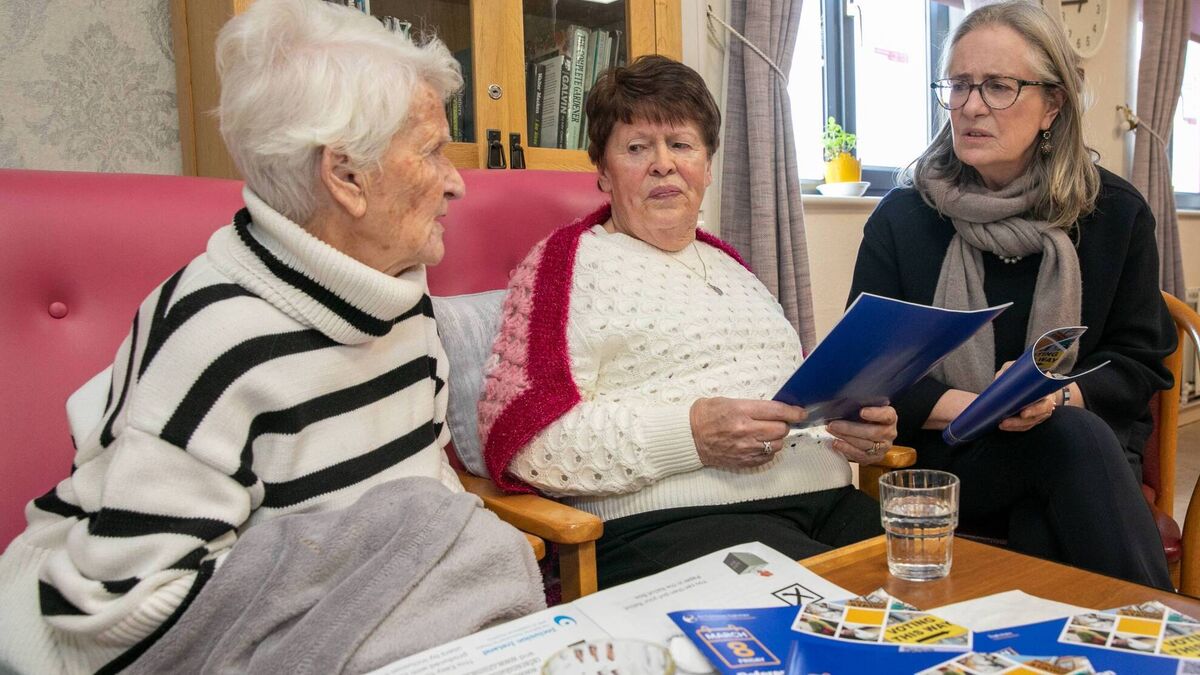 Ms Justice Marie Baker (right), Chair of An Coimisiún Toghcháin, speaking with Maura Kerrigan (left) and Rita Varian about the referenda at Ballyphehane Day Centre.