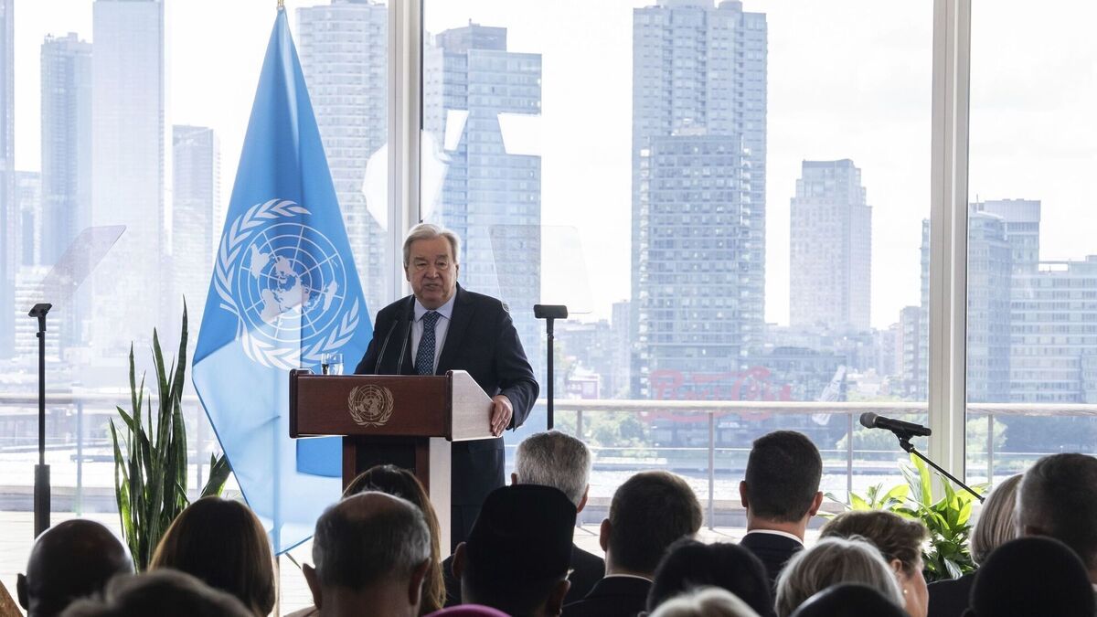 UN secretary general Antonio Guterres speaking at the United Nations headquarters. 'It’s long past time the United Nations itself left New York. Of its own volition. Before it’s kicked out.' Picture: Adam Gray/AP