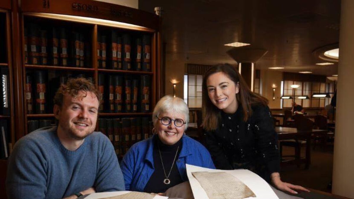 Dr Daniel Patterson, Prof Jane Ohlmeyer and Dr Bronagh McShane in the National Archives of Ireland viewing records from the Court of Chancery as part of the Voices project, which brings together historians and computer scientists to recover the lives of early modern women in Ireland.