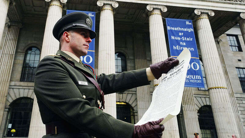 Captain Austin Doyle with the Proclamation of Independence following a ceremony at the GPO on O’Connell St in Dublin to mark the anniversary of the 1916 Easter Rising in 2023.