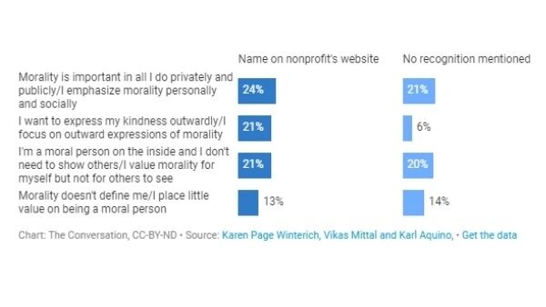 Of those who place a lot of importance on being moral, 21 percent gave their time when they didn’t know they could have their name listed on the website. When these people knew recognition was an option, their likelihood of volunteering only increased slightly, to 24 percent.