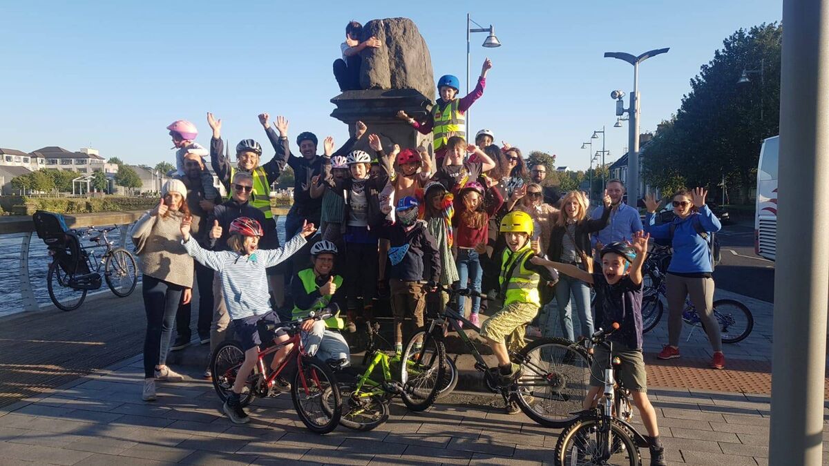 The Limerick Cycle Bus, a group of parents and kids who cycle together to school for safety, at the Treaty Stone in Limerick last summer. The cycle bus movement has taken off in Ireland.